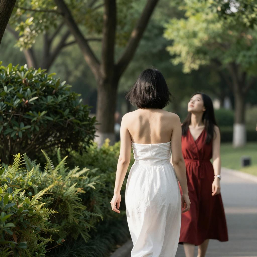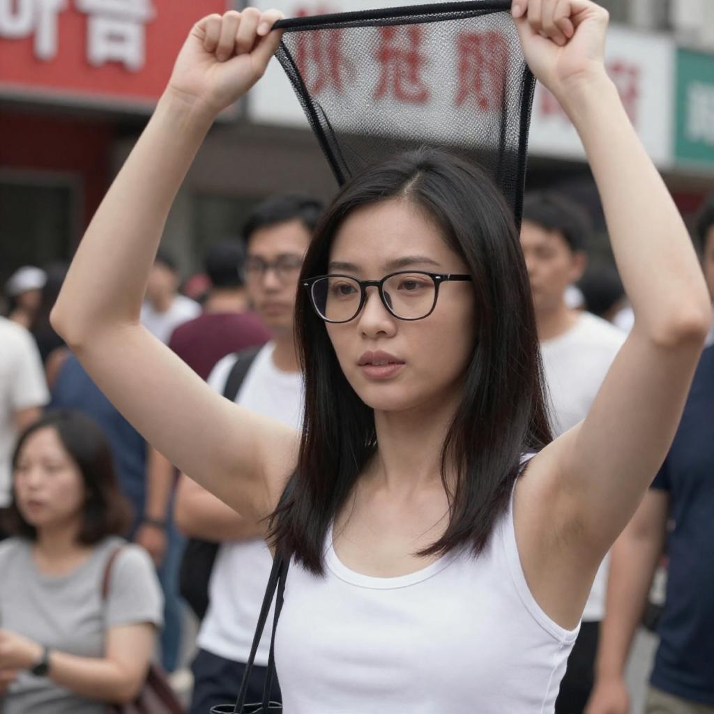 Photograph of three people wearing pink feather boas and hats, standing on a grassy hill. They hold pink signs with bold black . The middle person is male, raising his right arm. The two women on the sides have their arms crossed. Background includes trees, people sitting, and city buildings. Bright daylight.