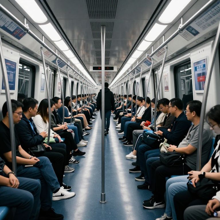 Passengers seated in rows on a subway train gaze forward as a solitary figure walks down the aisle, illuminated by overhead fluorescent lights that cast a cool glow over the polished floor and mirrored walls stretching into the distance.