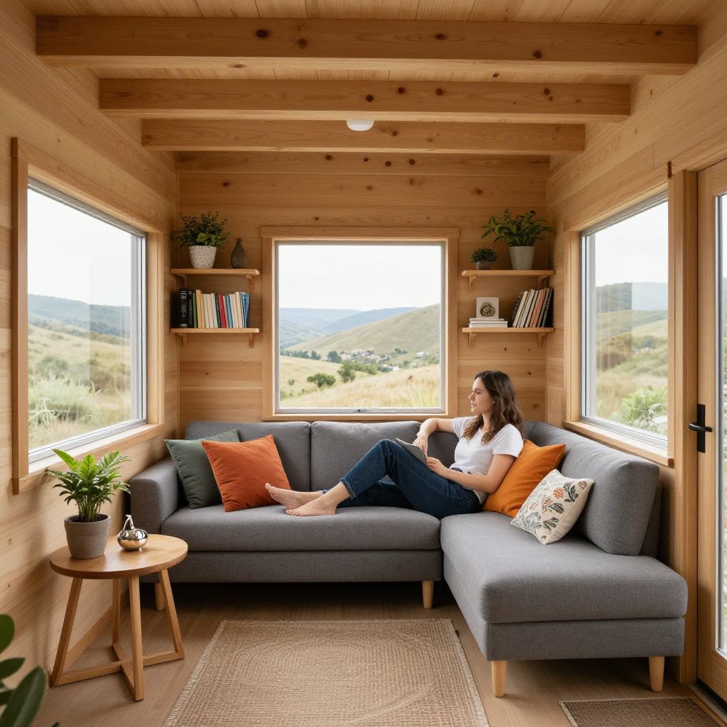 Woman relaxing in a cozy, minimalist tiny home with wooden interiors, surrounded by natural light streaming through three windows, featuring a comfortable gray sectional sofa adorned with colorful pillows, a small wooden side table with a plant and decorative items, and shelves above filled with books, plants, and decor, all set against a serene outdoor backdrop of rolling hills.