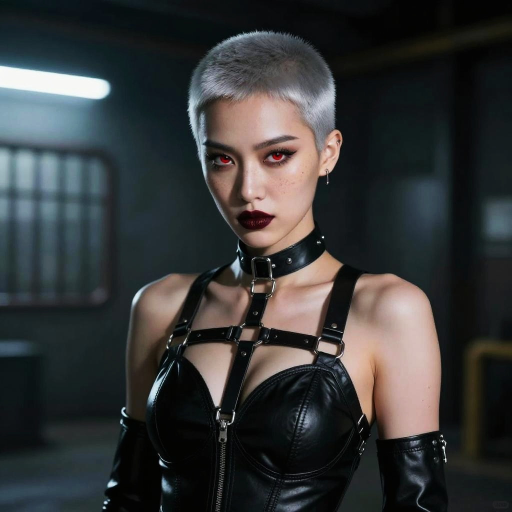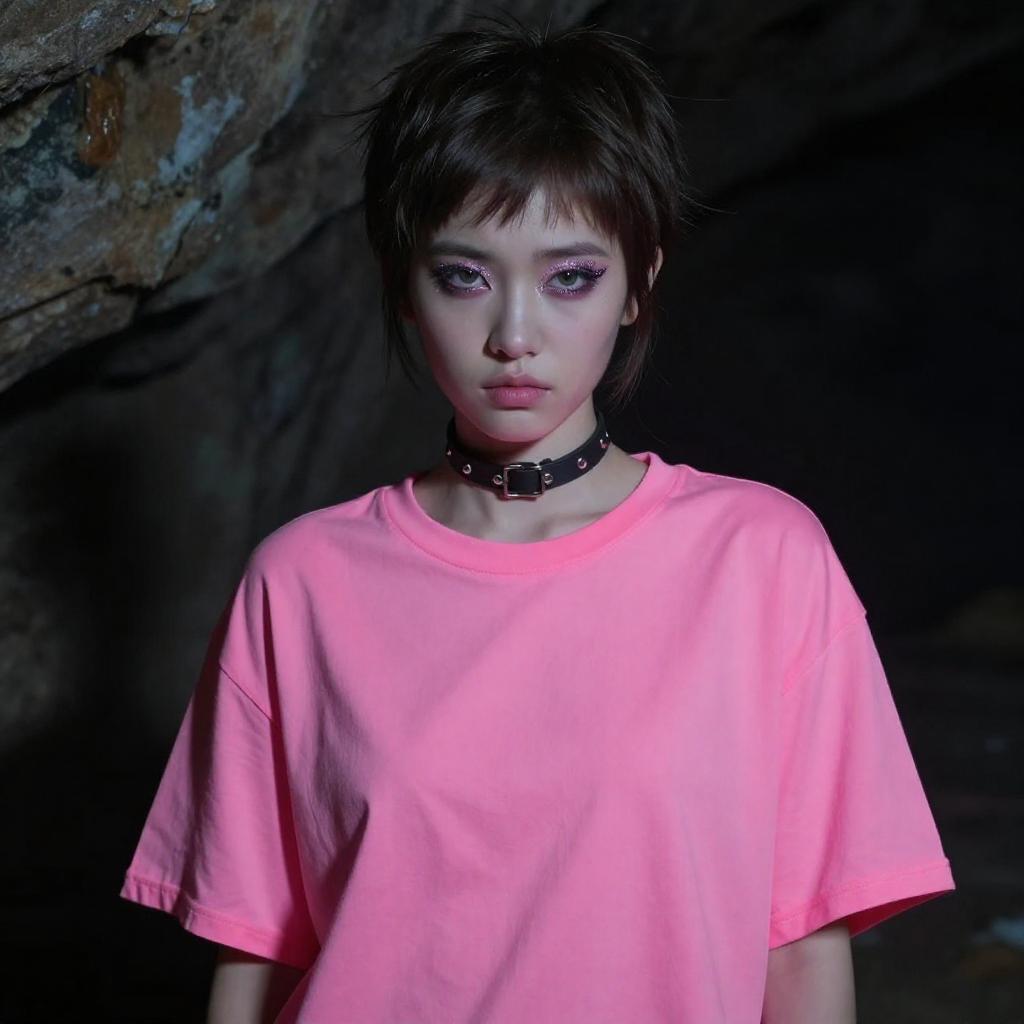 Raw photo, a cute skeptical girl, dark brown long pixie, 20 years old, eye shadow, glitter eyeliner, bulky, choker, realistic skin texture, oversize t-shirt, (Fluorescent Pink:0.8), hardcore, cold lighting, morbid atmosphere, trending on ConceptArtWorld style, fashion (cave:1.1), (sfw:0.9), highly detailed photography, (muted colors, cinematic, dim colors, soothing tones:1.2), vibrant, insanely detailed, hyperdetailed, (dark shot:1.2), (vsco:0.3)