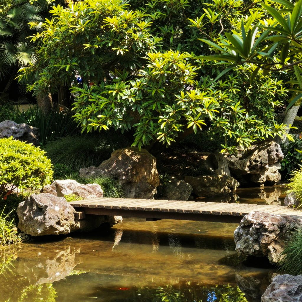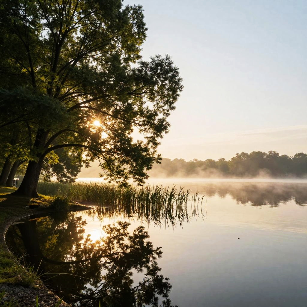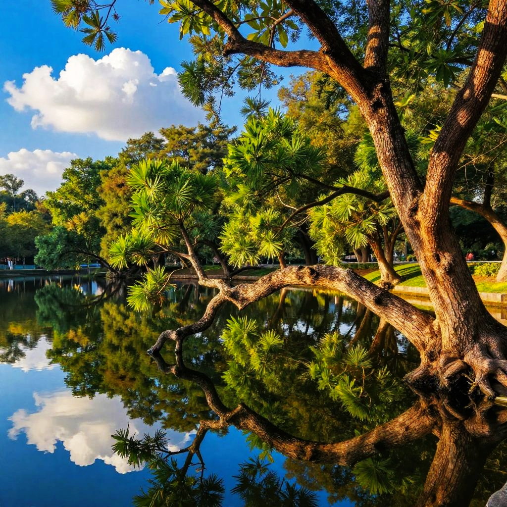 Vibrant landscape featuring a tree with textured brown bark and lush green leaves, its gnarled branches stretching over a calm blue pond. The clear water perfectly reflects the tree, bright blue sky, and fluffy white clouds, while warm sunlight casts a golden glow on the branches. A serene and picturesque natural setting.