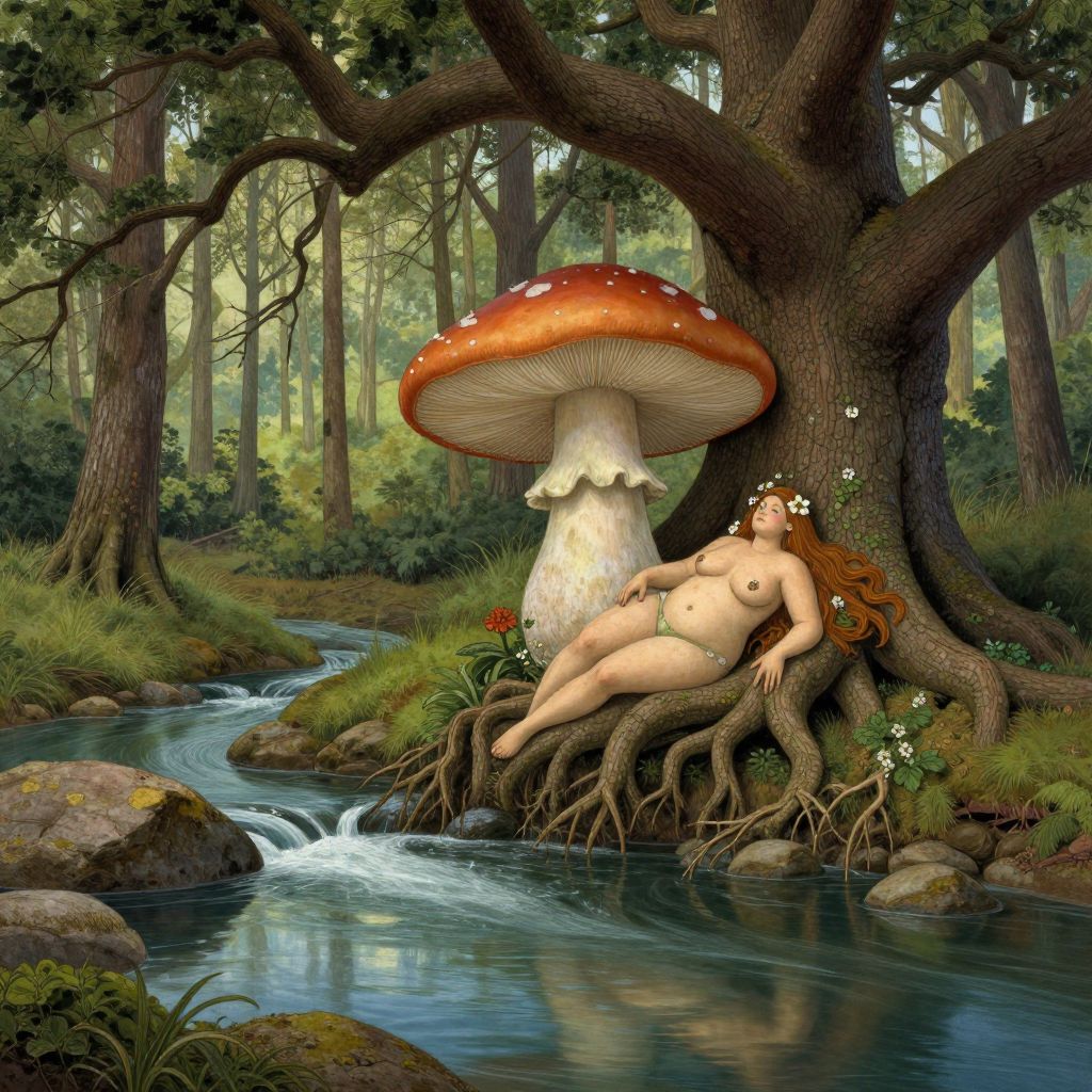 The image presents a captivating scene that blends elements of nature and fantasy, reminiscent of the styles of Bob Ross, Brian Froud, and Luis Royo. A giant mushroom, which also appears as a beautiful, full-figured woman, emerges from the roots of a large oak tree, creating a mystical and enchanting atmosphere. The mushroom-woman reclines gracefully on the banks of a river flowing over rocks, her long, flowing hair adorned with delicate white flowers. The scene is set in a deep forest, with tall, leafless trees and a serene, reflective body of water that mirrors the surrounding landscape. The interplay of colors, textures, and shapes creates a harmonious and immersive visual experience, with the soft greens of the forest, the earthy tones of the rocks, and the cool blues of the water. The overall composition is balanced, with the mushroom-woman positioned centrally, drawing the viewer's eye through the scene and highlighting the intricate details of the natural elements.