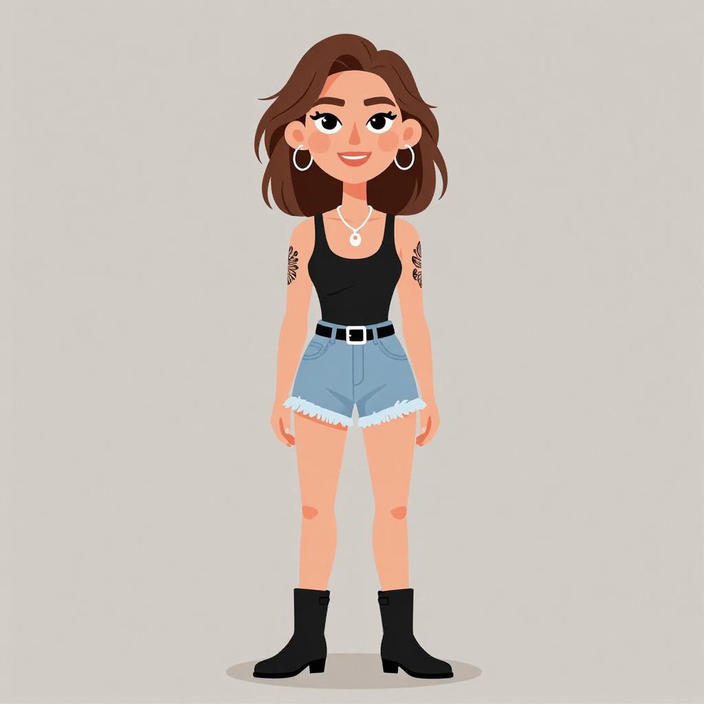 Woman with pretty face and pretty hair. smiling Woman, casual chic, black tank top, scoop neckline, light wash denim shorts with a frayed hem, black belt with silver buckle, minimalist pendant necklace, black ankle boots, tattoos on one arm, neutral studio background --sref 1467