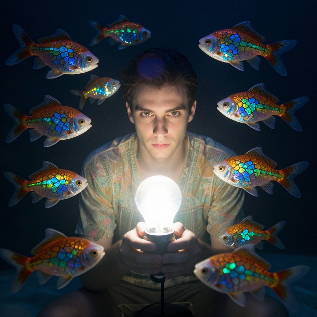 A digitally edited photograph features a young Caucasian man with short brown hair, wearing a light, patterned shirt, holding a glowing light bulb in his hands. He is centered against a dark background, surrounded by eight brightly colored, glowing goldfish with iridescent blue, green, and yellow spots. The fish are positioned in a circular pattern around him, creating a symmetrical, almost magical effect. The man's intense gaze is directed at the viewer, and the light bulb casts a bright, white glow, contrasting with the dark background and the vibrant fish. The overall composition is surreal and artistic.