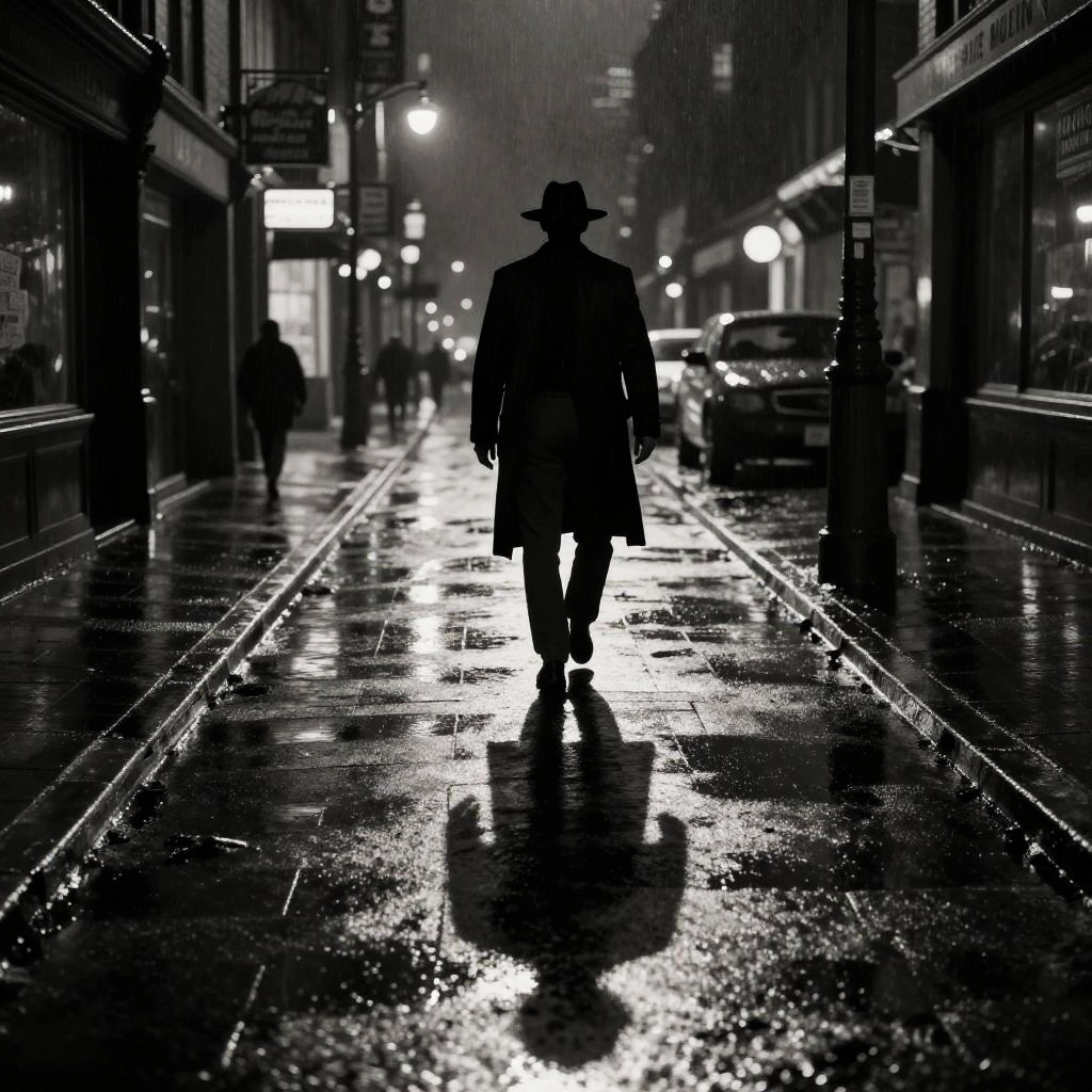 Noir comic style scene, moody city street at night, rainy reflections on pavement, mysterious detective silhouette, high contrast shadows, vintage urban atmosphere