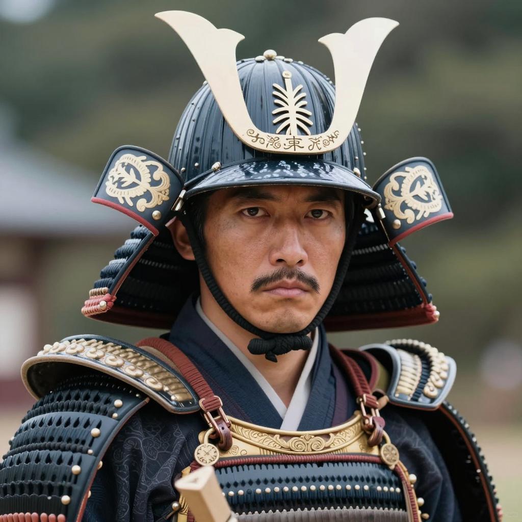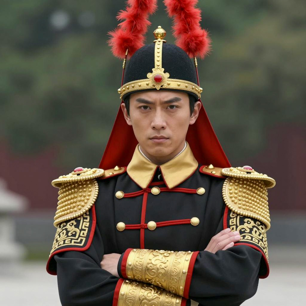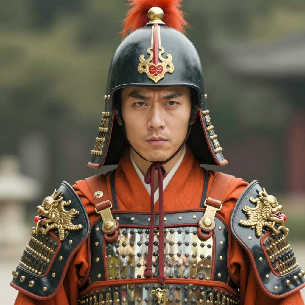 Josuke costume, photorealistic portrait of an Asian male, wearing traditional Chinese warrior armor, orange and black chest plate, black helmet with gold and red central design, serious expression, short black hair, blurred outdoor background with trees, daytime lighting, detailed ures, realistic style, close-up shot