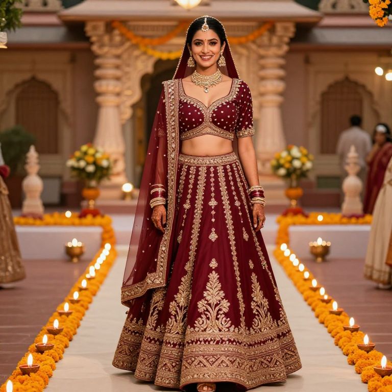 A glamorous Indian bride in her twenties with fair skin and a radiant smile, dressed in a maroon silk lehenga with a bold cut-out design and gold embroidery, walking down a grand wedding aisle adorned with marigold blossoms and diya lamps in a traditional temple courtyard