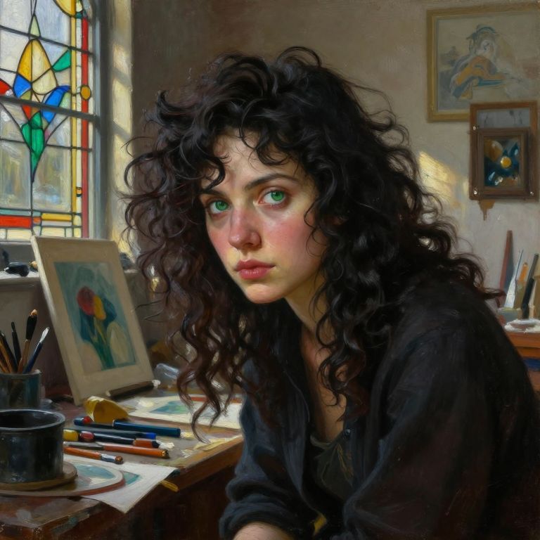 Craft a hyperrealistic oil painting portrait showcasing an engrossed reclusive artist with piercing green eyes and cascading dark curls. Capture her intense focus from a unique low-angle perspective as soft sunlight streams through stained glass windows, illuminating her enigmatic features. Amidst the clutter of half-finished masterpieces, tools, and remnants of a tumultuous past in her studio, her complex emotions are reflected in intricate detail, evoking both solitude and creativity.