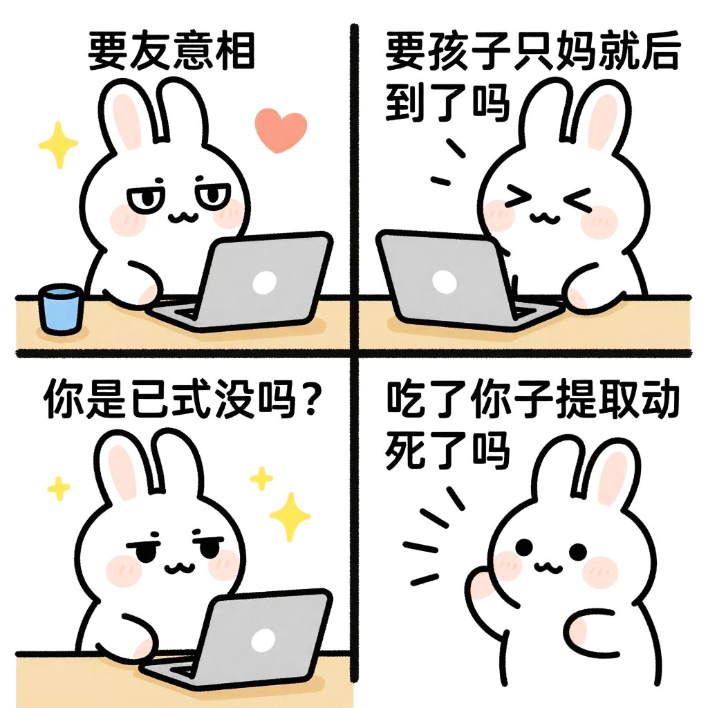 Four-panel manga-style comic of a white bunny using a laptop. Text in Chinese. Bunny has heart eyes, blushing, and looking tired. Bright