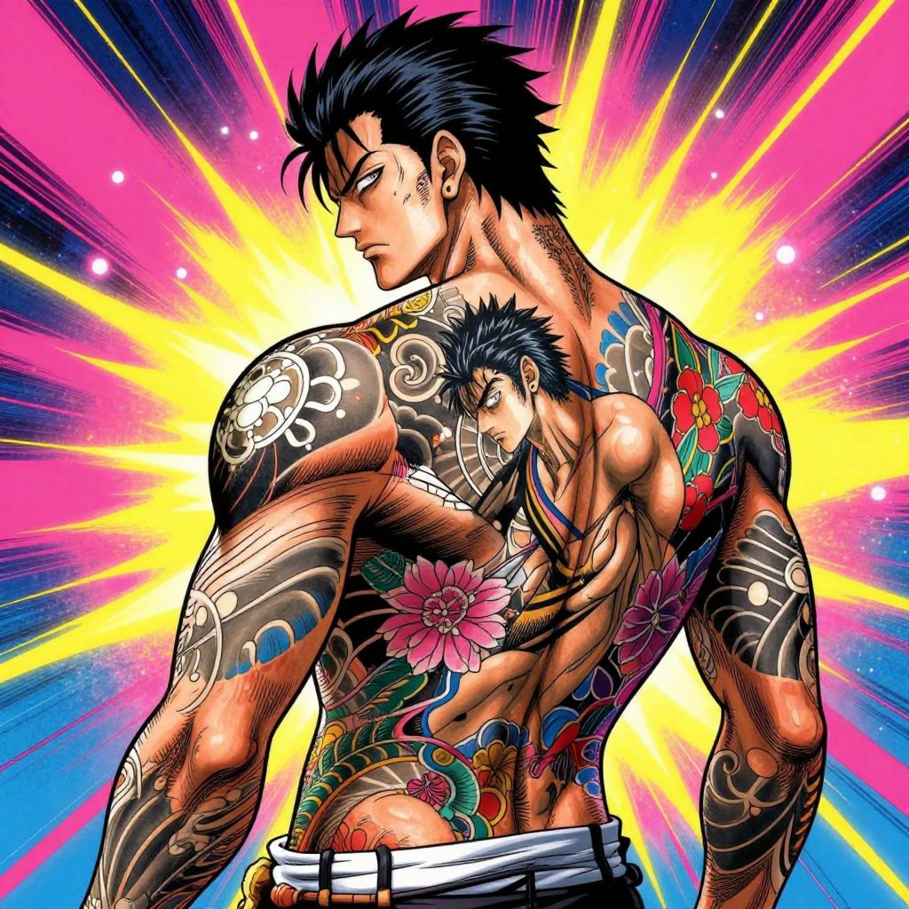 The image depicts a highly detailed and vibrant manga character, reminiscent of the Trigger Studio style, with a striking golden ratio composition. The character, likely a Japanese yakuza, is adorned with intricate tattoos that cover his entire body, including his back, arms, and neck. The tattoos feature a mix of traditional and modern designs, with a prominent figure of a man emerging from the back, surrounded by swirling patterns and floral motifs. The character's hair is styled in a rugged, spiky manner, adding to his rugged and intense appearance. The background is a burst of neon colors, including shades of pink, yellow, and blue, creating a dynamic and energetic atmosphere. The overall composition is balanced and visually engaging, with the character positioned centrally and the tattoos serving as the focal point. The use of inking and graffiti art techniques adds a gritty, edgy feel to the image, enhancing its manga and anime aesthetic.