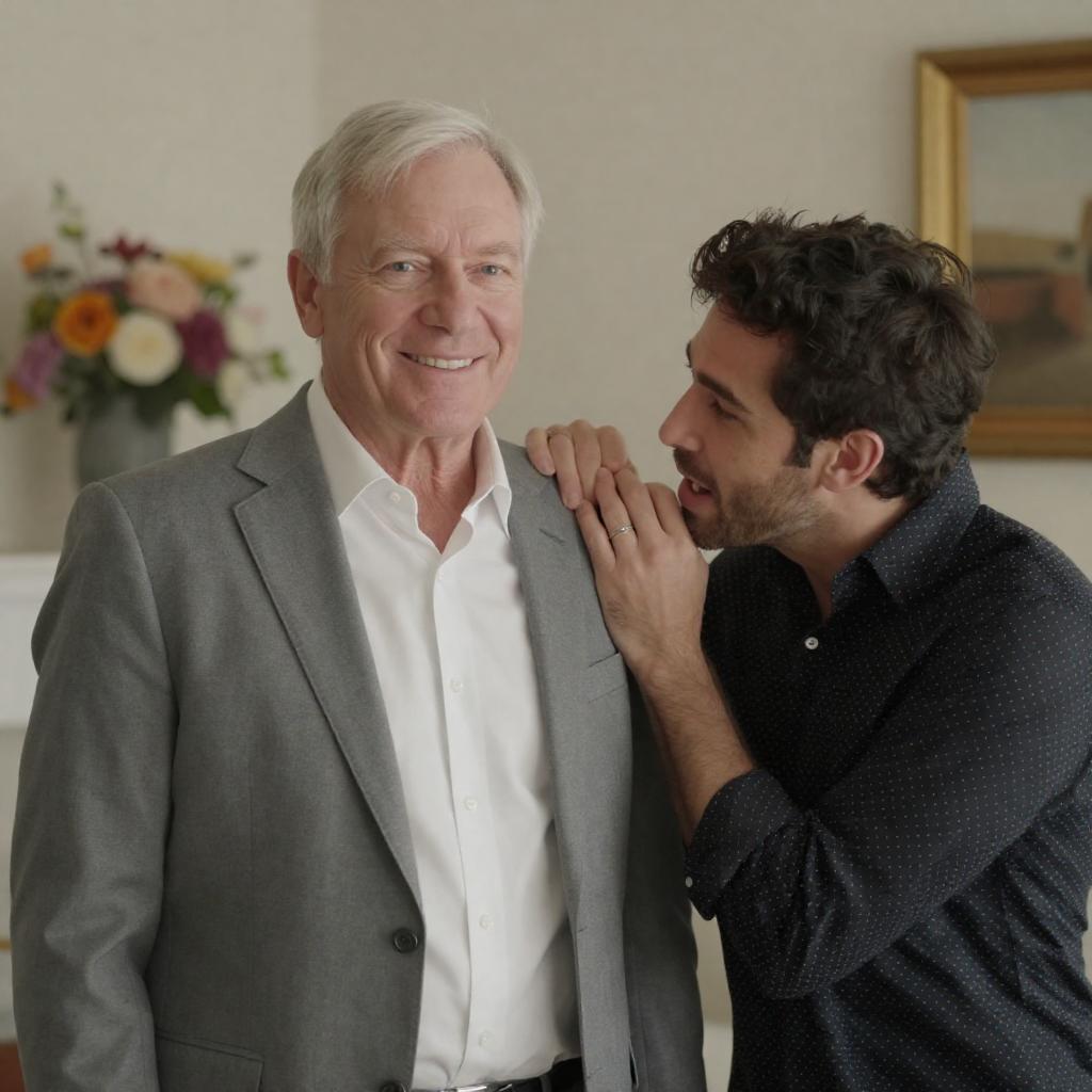 Photograph of an older man with gray hair and beard, wearing a white shirt and pants, sitting on a wooden platform, talking to a younger man with short dark hair, wearing a white t-shirt and plaid pants, standing and leaning on the platform. Bright sky in the background.