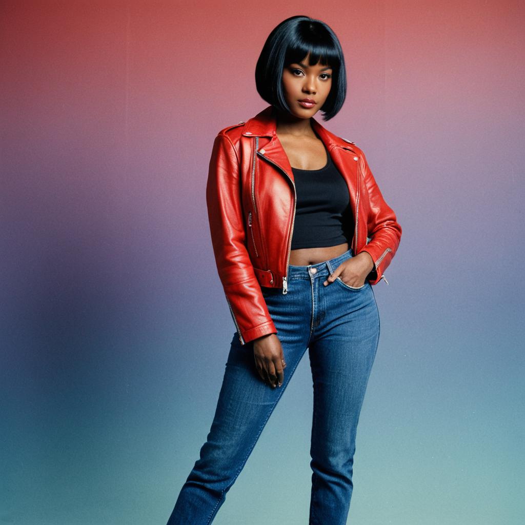 Portrait of a confident young Black woman with a black bob haircut wearing a classic 90s style red leather jacket over a black cropped tank top and blue denim jeans. She poses standing against a soft gradient background transitioning from reddish to blue hues.
