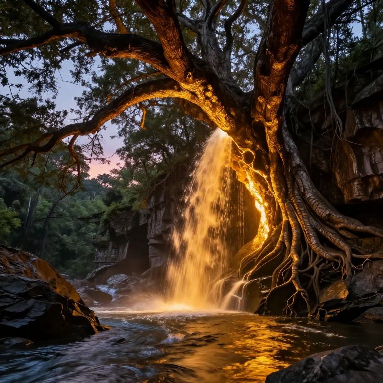 Photograph of a dramatic natural scene featuring a large tree with thick, twisting roots and a glowing, golden waterfall cascading down its side. The tree's bark is dark and textured, contrasting with the bright, luminous water. The background includes dense, green foliage and a rocky cliff. The water reflects the golden light, creating a striking, ethereal effect. The sky is faintly visible, tinged with pink and blue hues from the setting sun. The overall composition is rich in contrast and vibrant colors, emphasizing the surreal beauty of the scene.