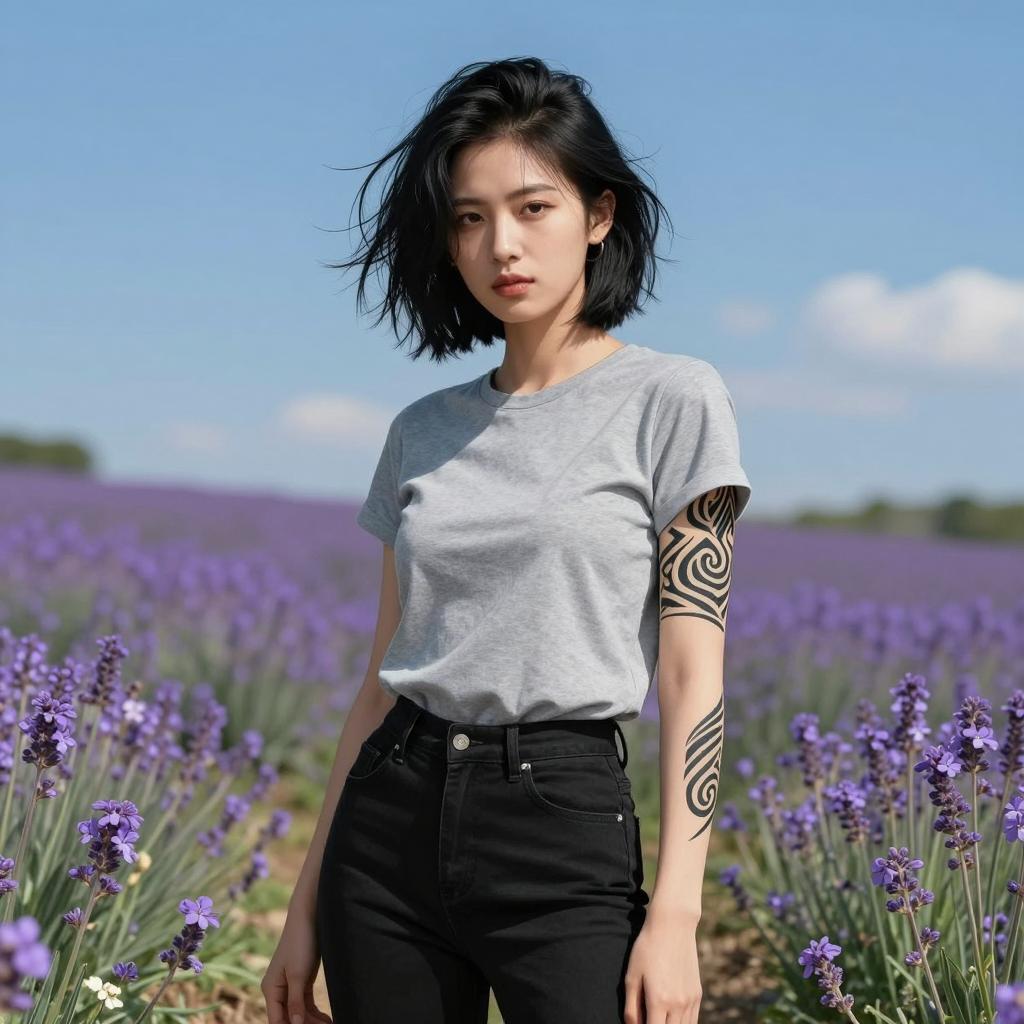 This digital artwork features a confident young woman with short black hair styled in an edgy, tousled look, standing in a vibrant field of purple flowers under a clear blue sky. She wears a casual grey t-shirt and black bottoms, showcasing detailed tribal tattoos on her arm and side, rendered in a modern, semi-realistic comic style with bold lines and rich colors.