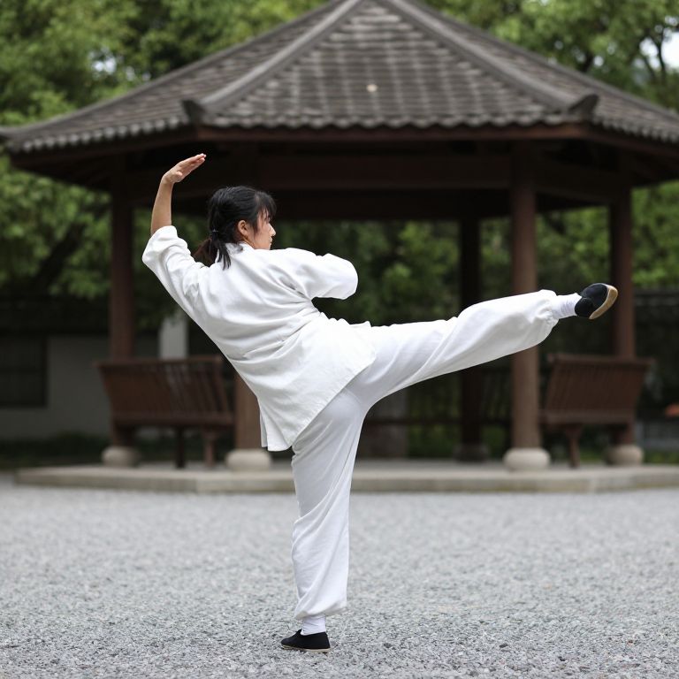 Photograph of a person performing a martial arts move outdoors. The person, dressed in a flowing white traditional outfit, is in a dynamic side kick with their right leg extended and left arm raised. The background features a wooden pavilion and lush green trees. The ground is gravelly, and the image has a shallow depth of field, making the background blurry.