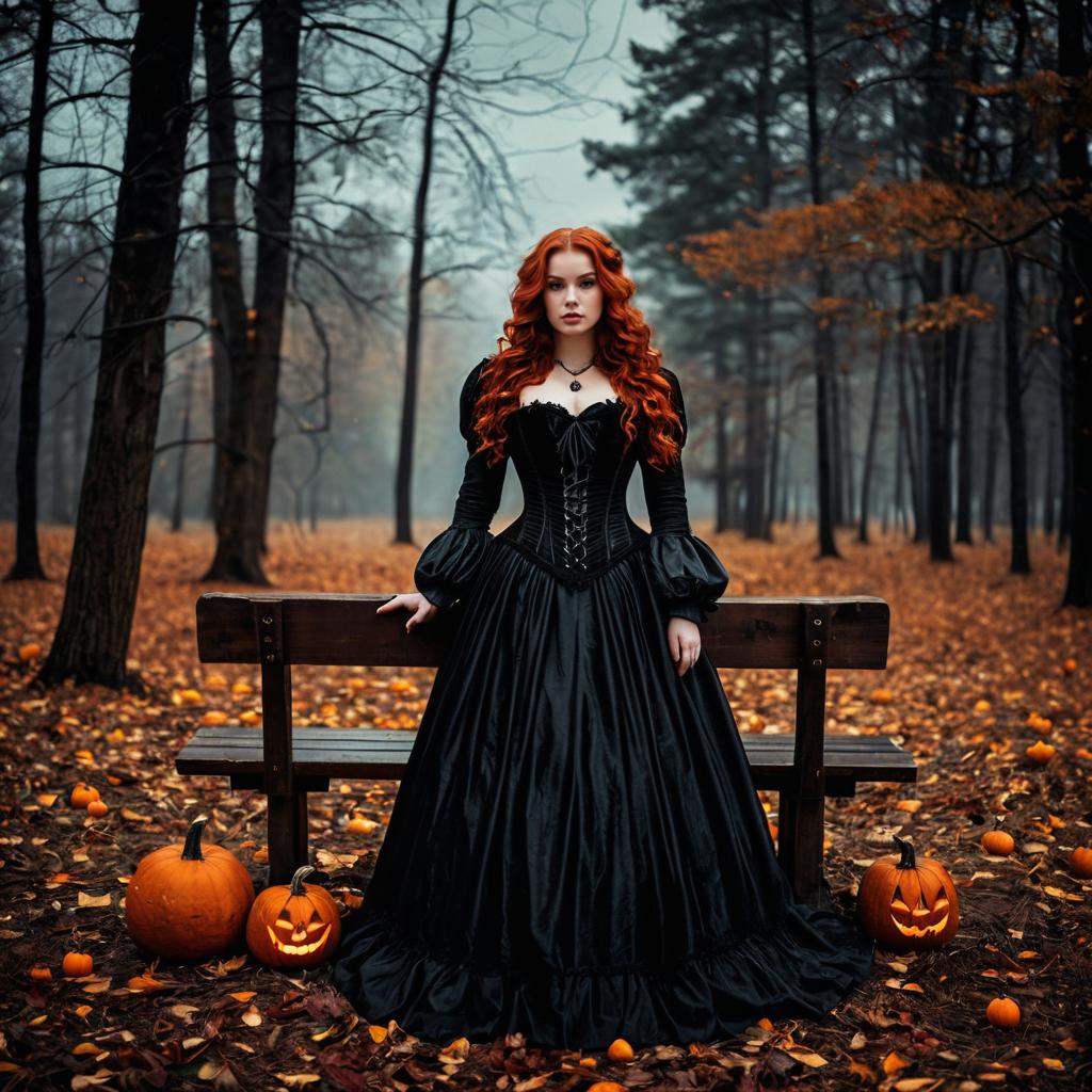 Gothic Woman with Jack-o'-Lanterns on Halloween Night