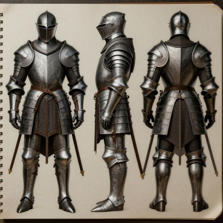 This digital drawing showcases a full-body view of medieval European knight armor from three angles: front, side, and back. The armor is polished silver with intricate engravings on the chest plate and shoulder guards. It includes a helmet with a nose guard, articulated elbow and knee guards, and a chainmail skirt. The knight's gauntlets and boots are also armored, with the boots having pointed toes. Two short swords are sheathed on either side of the chainmail skirt. The background is a plain, off-white color with a spiral-bound edge on the left. The style is realistic with a focus on detailed textures and metallic sheen.