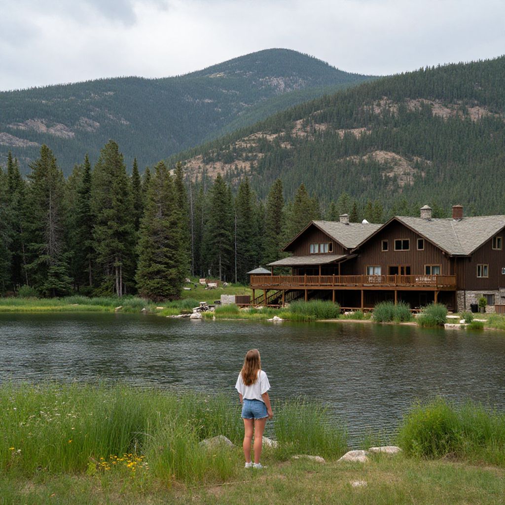 Photograph of a young woman with long brown hair, wearing a white blouse and blue denim shorts, standing on a grassy lakeshore, facing a wooden cabin with a large deck overhanging a calm lake. The cabin is nestled among dense evergreen trees, with mountainous, forested hills in the background under a partly cloudy sky. The woman is centered in the foreground, while the lake and cabin occupy the midground, with the mountains rising in the background. The scene is serene and picturesque, with vibrant green grass and yellow wildflowers in the foreground.