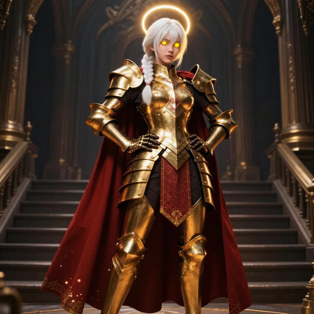 1girl, full body of beautiful paladin, hands on hips, athletic, braid, white hair, yellow eyes, glowing eyes, glowing halo, golden heavy armor, long skirt, red cape, particles, dark dungeon indoors, stairs, volumetric lighting, best quality, masterpiece, intricate details, tonemapping, sharp focus, very detailed, trending on Artstation, realistic