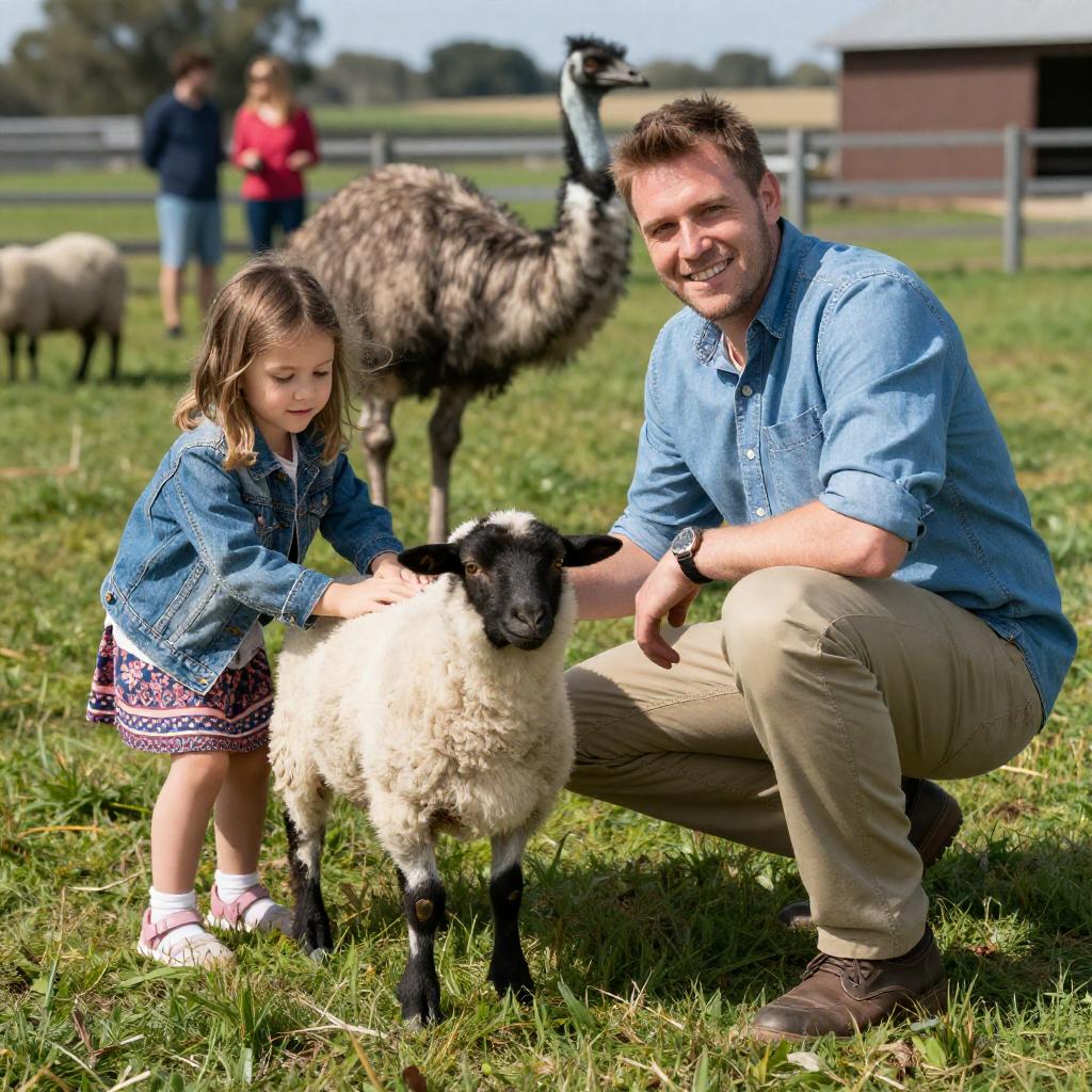 Photograph of a smiling man and young girl crouching on grass, petting a black-and-white sheep. The man wears a blue shirt and khaki pants, while the girl wears a denim jacket and patterned skirt. An emu stands in the background, and other people and sheep are visible in the fenced pasture. Bright sunlight illuminates the scene.