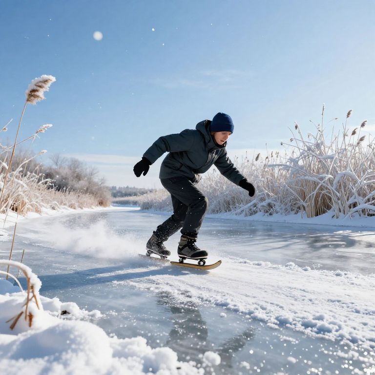 Energetic winter sport setting featuring a skater wearing marshblades speeding along a frozen river, surrounded by snowy reeds and frost-laden shrubs, under a clear blue sky with sparkling snowflakes suspended in the air.