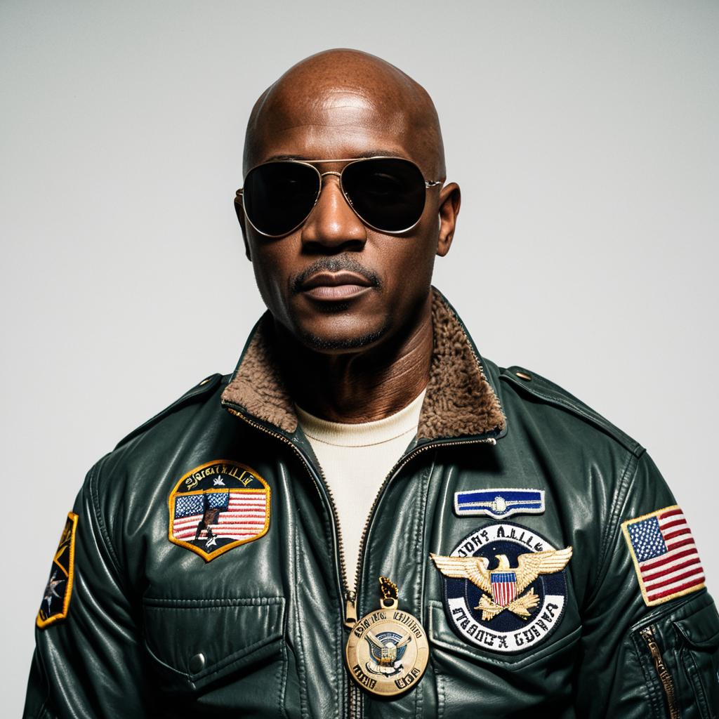 Charles 'Chappy' Sinclair cosplay costume, Iron Eagle III Louis Gossett Jr., African American bald male wearing vintage pilot flight suit, patched aviator jacket, dog tags, serious expression, fisheye, depth of field, simple background