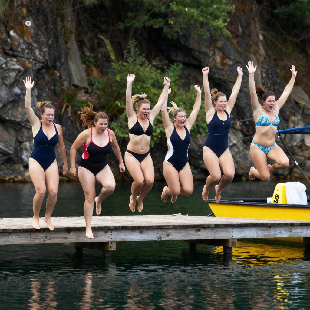 Photograph of six women in swimsuits jumping energetically off a wooden dock into a lake surrounded by rocky cliffs and dense greenery. The women vary in physique and swimsuit style, with arms raised mid-jump. A yellow and black boat with supplies is docked to the right. Clear reflections appear on the lake surface.