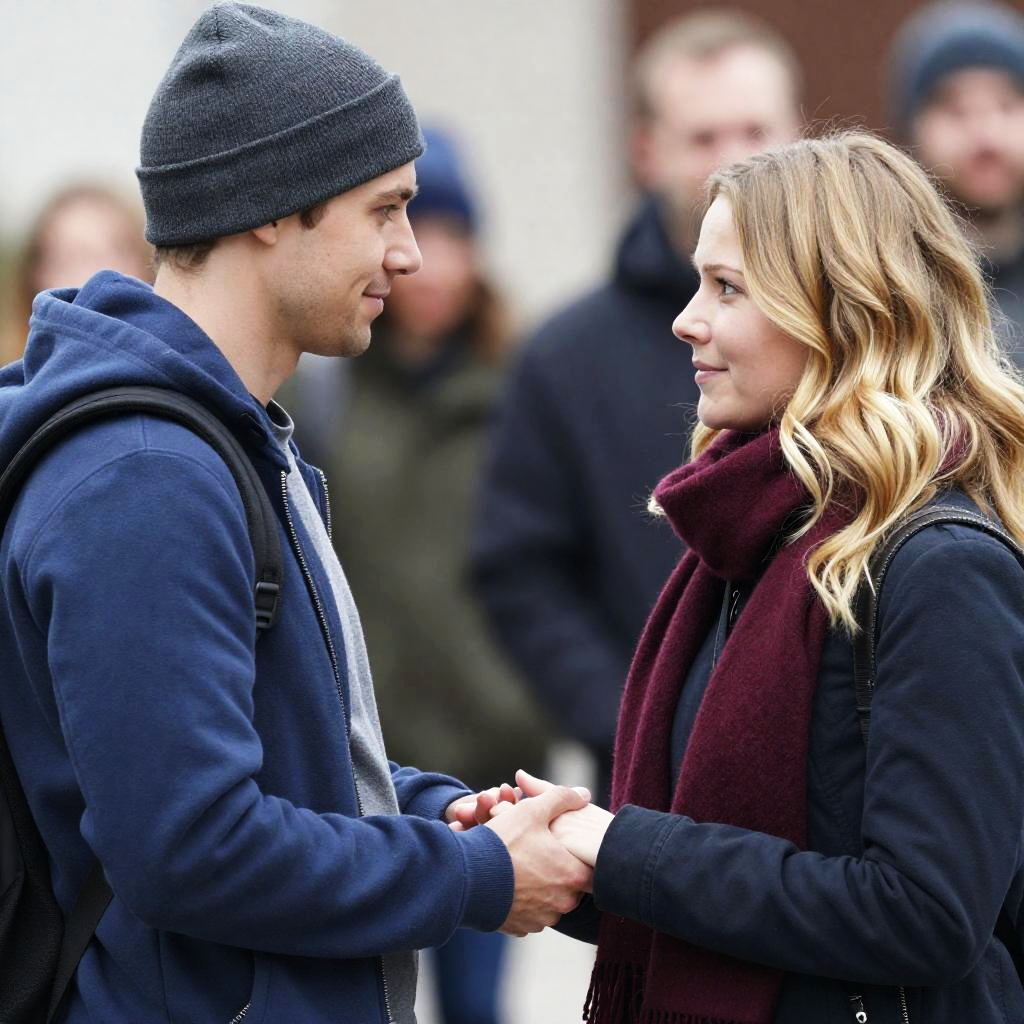 Photograph of two people in winter clothing. Blonde woman in brown coat with fur hood, hand on brown-haired person's head, looking worried. Snowing, brick wall background, green-coated man with fur hat in background. Snowflakes visible on clothing.