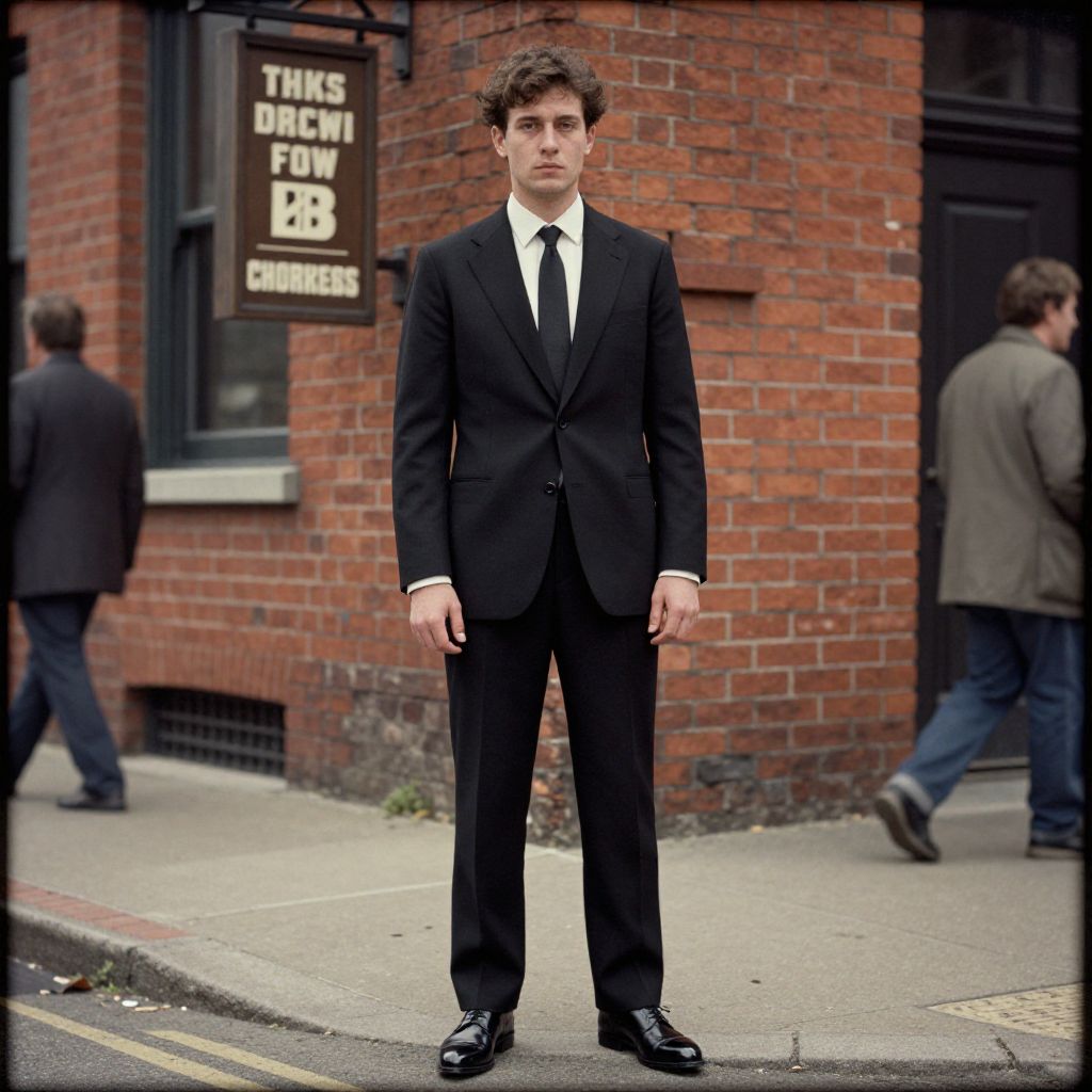A man, classic black suit, ivory dress shirt, slim black tie, glossy black leather monk strap shoes, red brick building, vintage wooden sign, bustling street corner, daguerreotype film, confident expression Man has masculine face and piercing eyes
