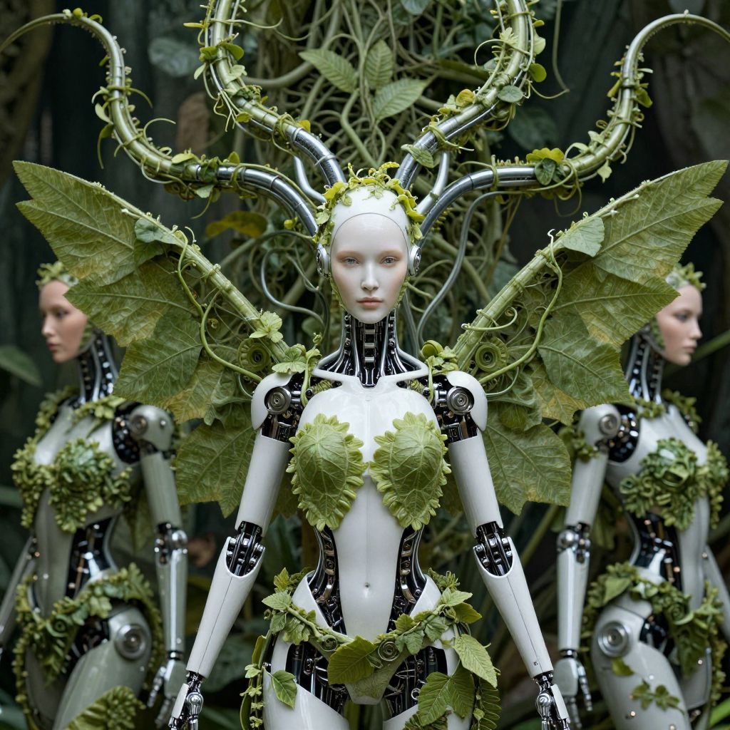 Photograph of three humanoid robots with pale white skin, dressed in intricate, nature-inspired costumes. They have large, green, leafy wings and elaborate, vine-like headpieces with curled branches. Their torsos are adorned with green leaf clusters, and their limbs are a mix of metallic and organic textures. The background is dark and forest-like, with dense foliage. The robots have a futuristic yet ethereal appearance, blending mechanical and natural elements. The central robot is slightly more prominent, with a focused expression. The image has a surreal, fantasy-like quality.