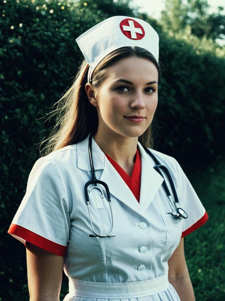 Woman in Nurse Costume, photorealistic outdoor portrait, daylight