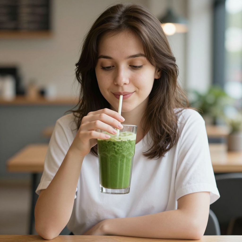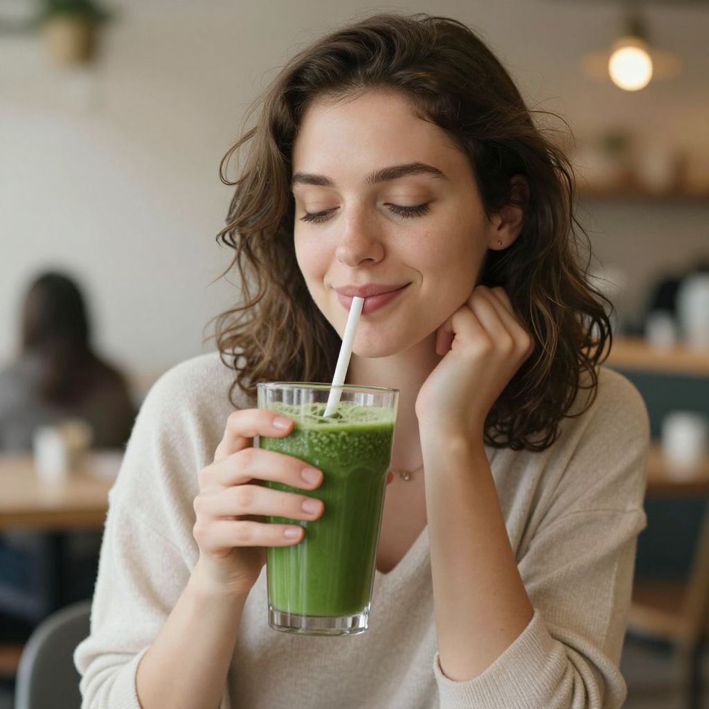 Amidst the soft hum of a cozy café, a woman sips a vibrant green smoothie, her smile radiating a quiet joy that transcends the mundane, embodying the simple yet profound pleasure of nourishing both body and soul.