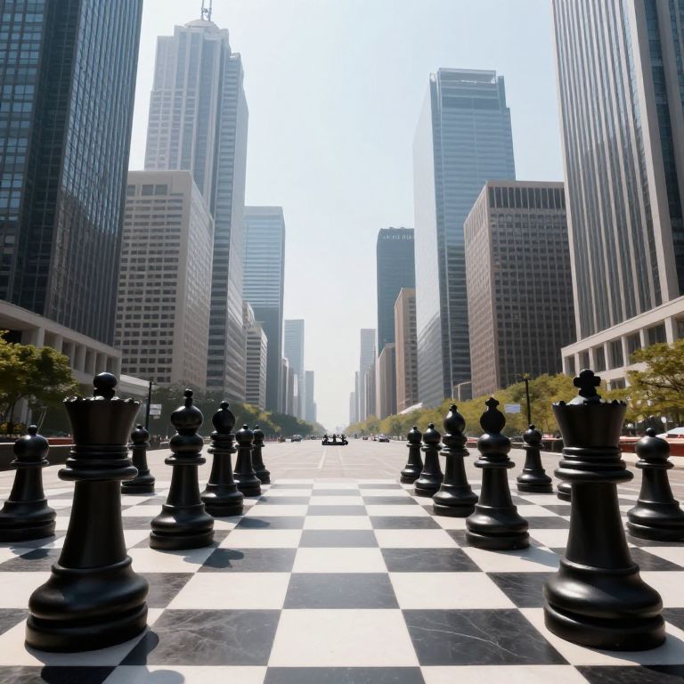 A surreal cityscape unfolds where towering skyscrapers flank a grand avenue paved with a giant chessboard, its oversized black pieces standing sentinel, defying scale and reality as they stretch toward the horizon.