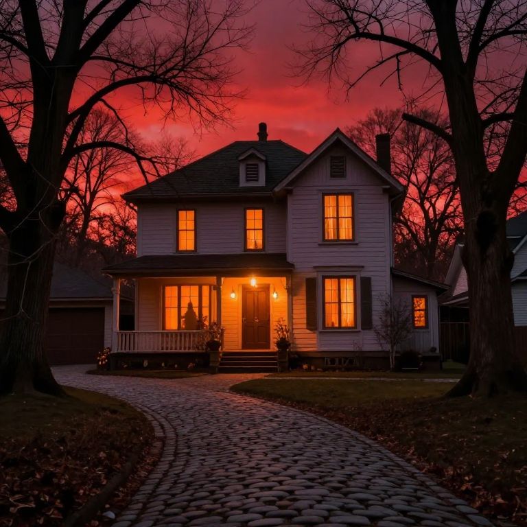 Mysterious Halloween ambiance unfolds with a quaint two-story house illuminated by warm orange lights, set against a blood-red sky and framed by bare, gnarled trees, as a winding cobblestone path leads up to its inviting yet eerie entrance.