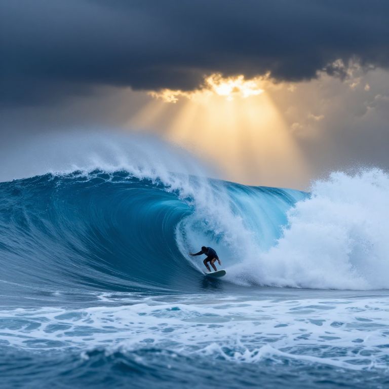 Photograph of a surfer riding a massive, blue-capped wave under a dramatic, cloud-filled sky with sunlight breaking through.