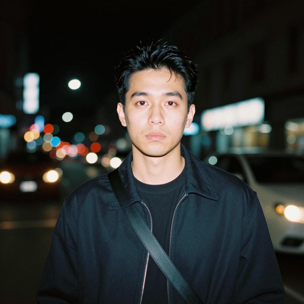 A striking portrait of a man captured in a blurry night street scene, emphasizing the atmospheric quality of flash photography. The image evokes a cinematic feel, reminiscent of classic analog medium format film styles, with vibrant city lights creating a dynamic backdrop.