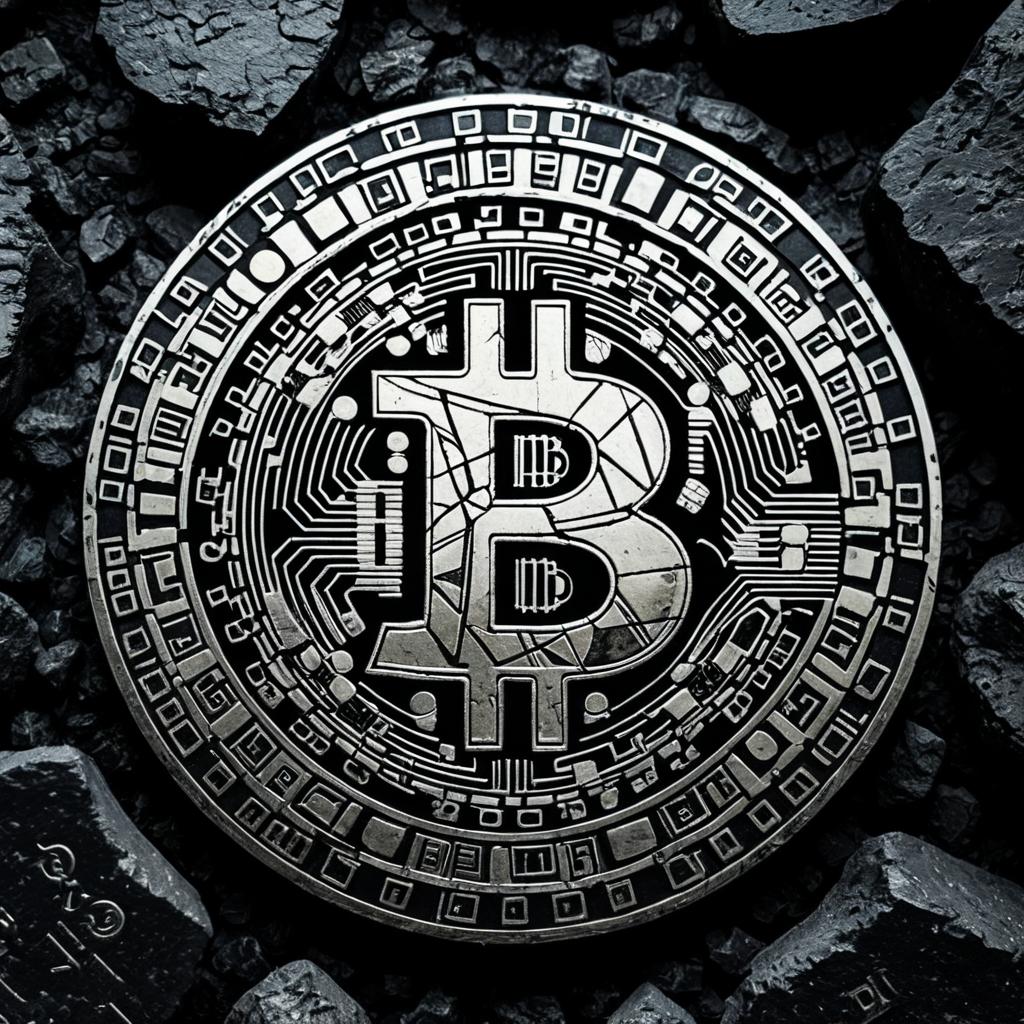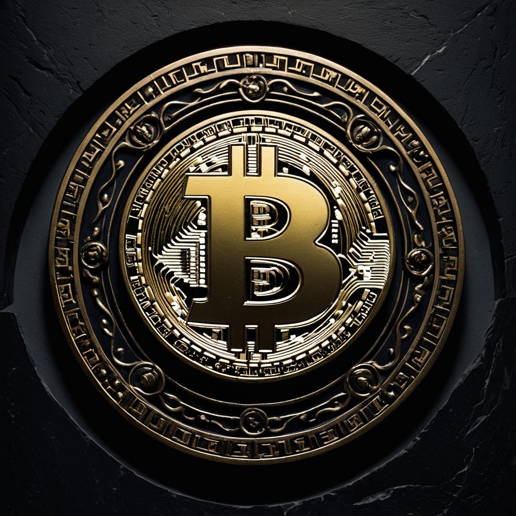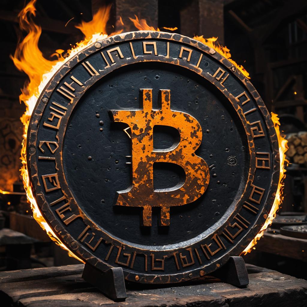Artwork of bitcoin logo as an ancient artifact, hammered onto a rusted iron forge plate, surrounded by fiery alchemical signs pulsating faintly, set in an old blacksmith’s workshop cloaked in shadow