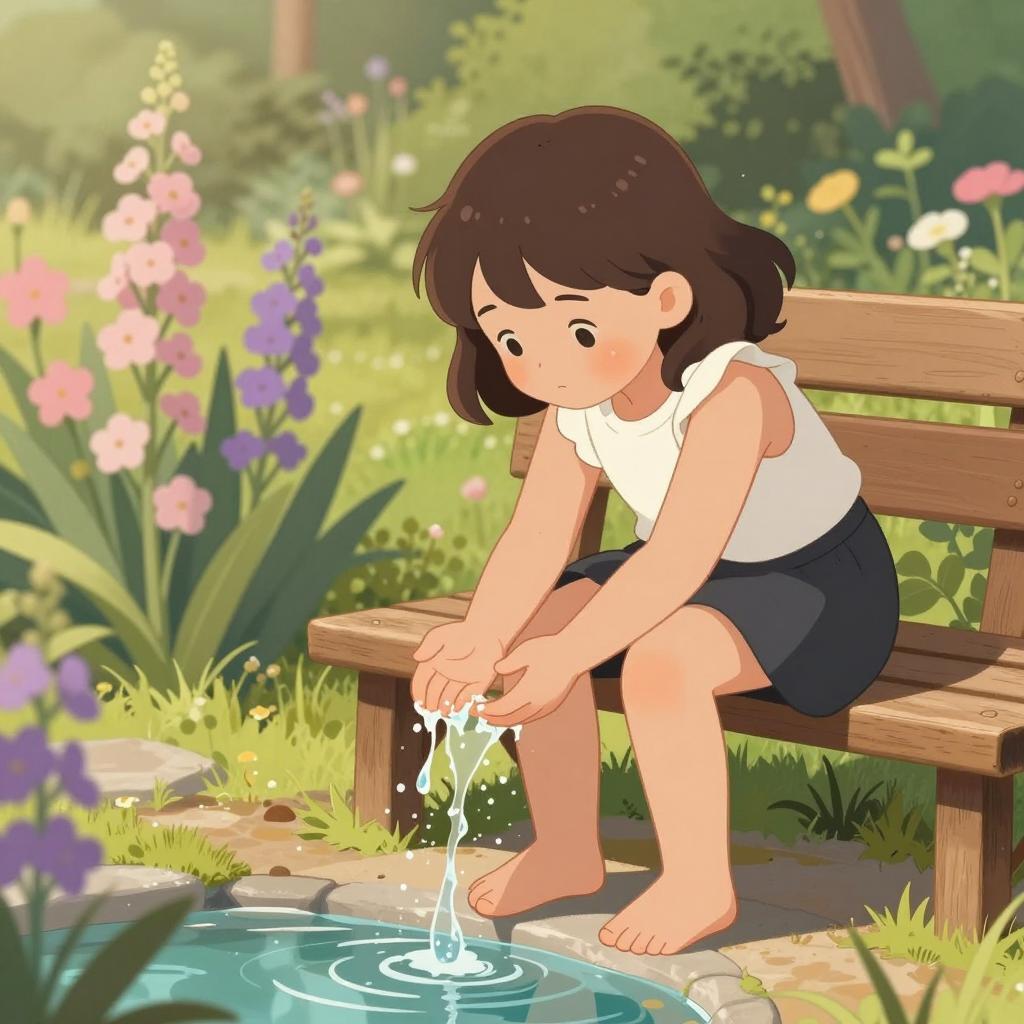Illustration of a young girl with wavy brown hair, wearing a white sleeveless top with ruffles and black skirt, sitting on a wooden bench. She is barefoot, bending forward, splashing water from her hands into a small pond. Surrounding her are tall flowers with pink and purple blooms, green foliage, and a blurred garden background. Her face is slightly downcast and focused on the water. The scene is brightly lit with natural sunlight.