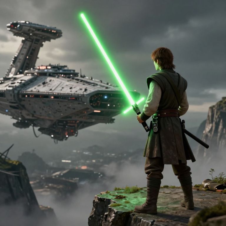 Drop Shadow a young Jedi Knight with a green lightsaber drawn on the edge of a cliff looking at a destroyed Star Destroyer and an approaching Sith realistic graphic 4k,