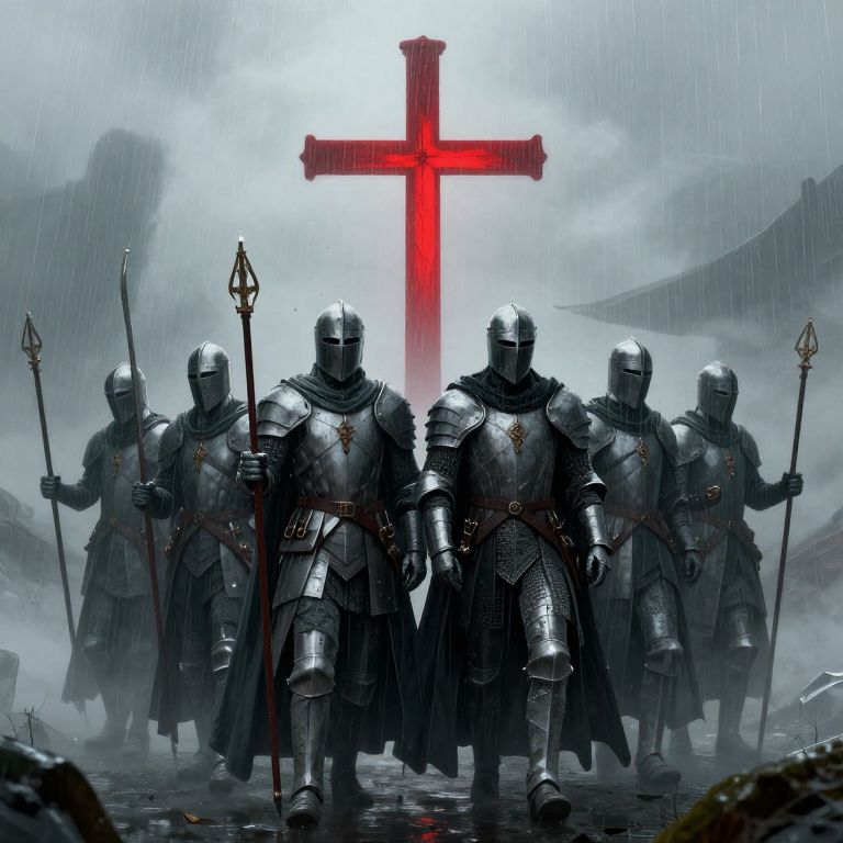 Photograph-like digital art of five armored knights with helmets, standing in rain, holding spears, behind a glowing red cross.