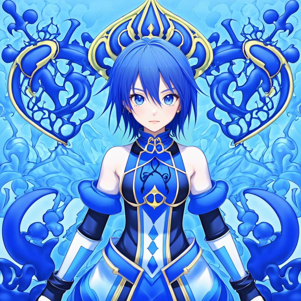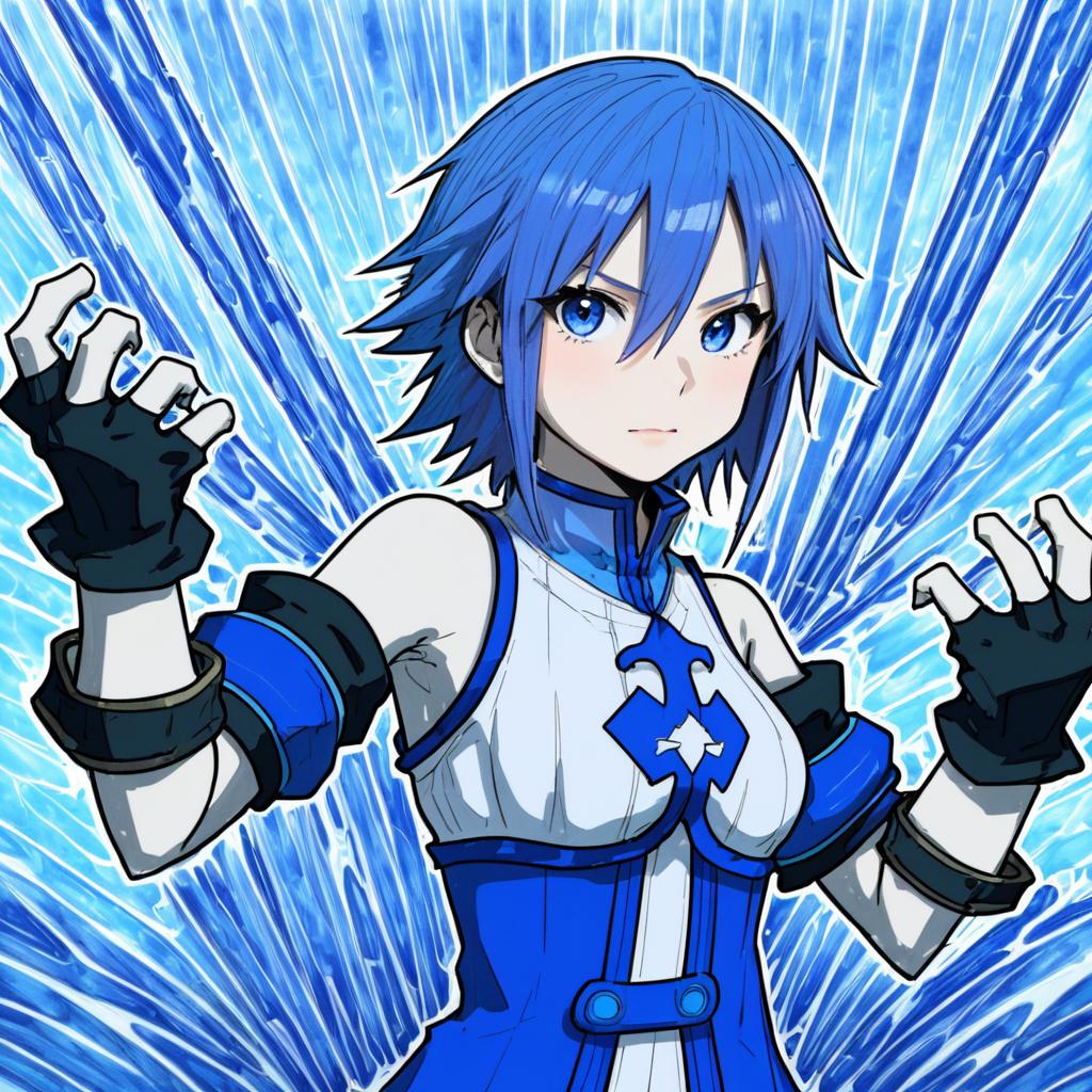 Aqua (kingdom hearts), kingdom hearts, 1girl, blue eyes, hair between eyes, blue hair, short hair, medium breasts, fingerless gloves, bare shoulders, detached sleeves, by artist hiramedousa, animagine