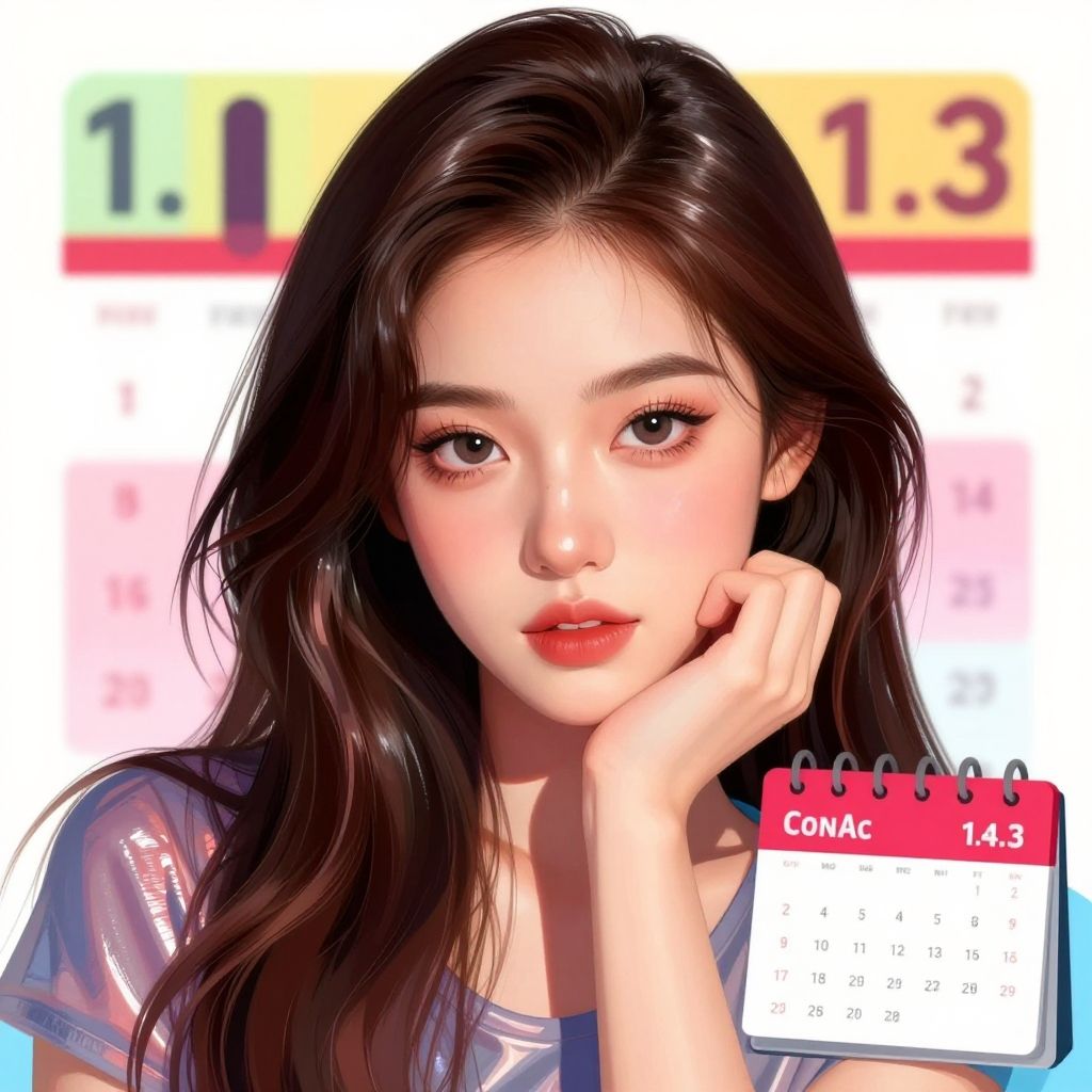This digital illustration features an attractive young Asian woman with long, dark brown hair and fair skin. She has large, expressive brown eyes, delicate eyelashes, and full, red lips. She rests her chin on her right hand, gazing softly at the viewer. She wears a translucent, blue shirt. The background shows a blurred, colorful calendar with "13" prominently displayed in yellow and red. A small, red and white calendar in the bottom right corner reads "COMAC 14.13." The style is hyper-realistic with a focus on soft, detailed textures and vibrant colors.