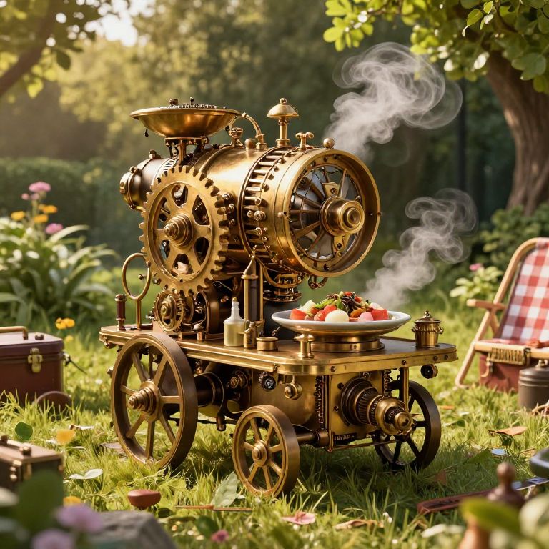 Luncher, an elaborate steampunk machine designed for preparing gourmet meals outdoors, surrounded by lush greenery and vintage picnic gear, warm golden hour lighting, intricate brass gears and steam effects, hyper-realistic style.