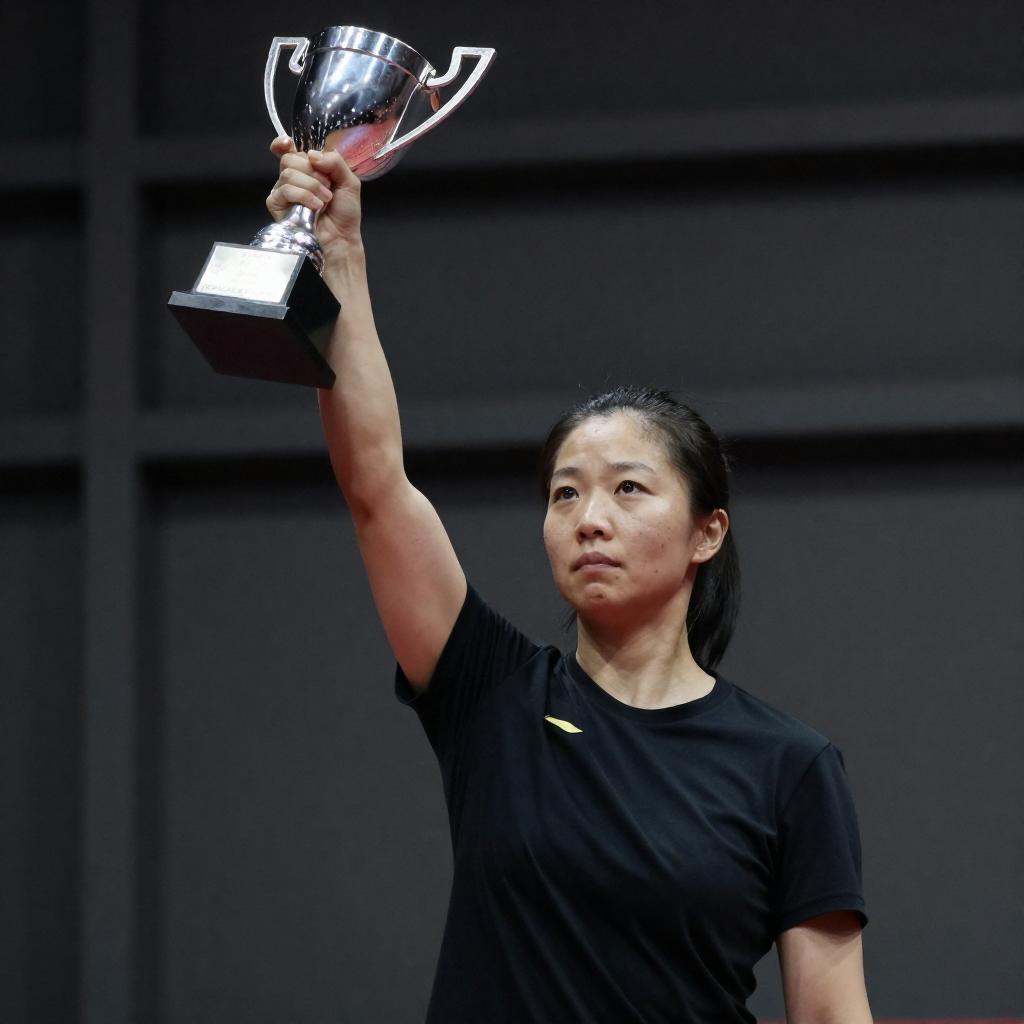 Photograph of an Asian woman with dark hair in a black shirt, holding a silver trophy aloft with her right hand. She stands in a dimly lit, industrial background with dark, ured walls and metal structures. Her expression is focused and determined.