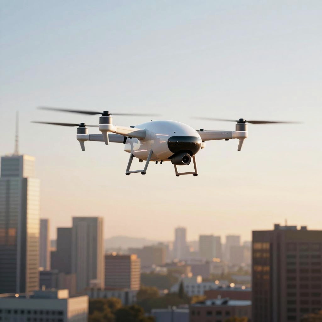 Shipping prompts depicting a minimalist delivery drone flying over city skyscrapers at sunset, sleek design, soft warm tones, futuristic urban environment