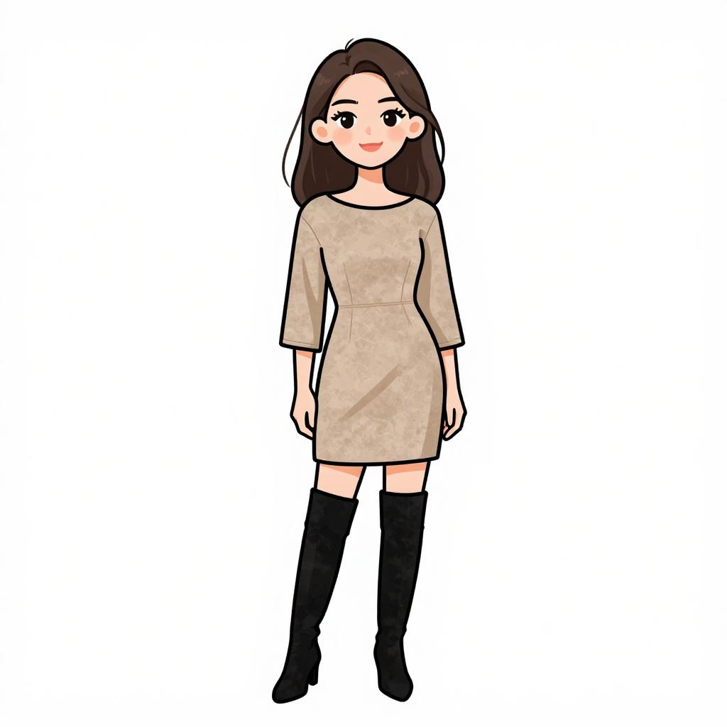 Woman with pretty face and pretty hair. smiling Woman, minimalist, suede shift dress in neutral beige, three-quarter sleeves, boat neckline, thigh-length, black suede over-the-knee boots. --sref 1467
