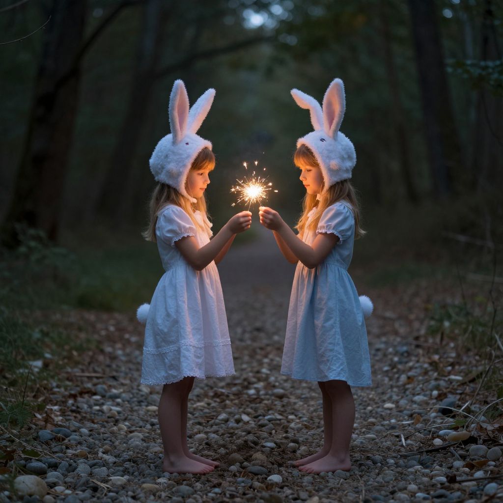 Photograph of two young girls in white bunny ears and dresses, holding a sparkler, standing barefoot on a forest path at dusk.