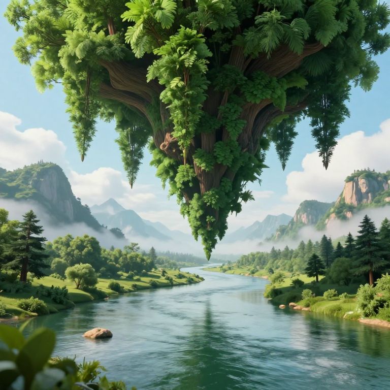 This digital fantasy artwork depicts a serene valley landscape featuring a large, lush, tree-like structure with dense green foliage hanging above a calm, reflective river. The background showcases mist-covered mountains and a clear blue sky with fluffy white clouds. Dense pine trees and grassy patches line the riverbanks, adding to the vibrant greenery. The river's surface is smooth, with a few small rocks visible near the foreground. The overall scene is bright and airy, with a magical, otherworldly atmosphere. The detailed textures and realistic lighting enhance the fantastical yet natural setting.