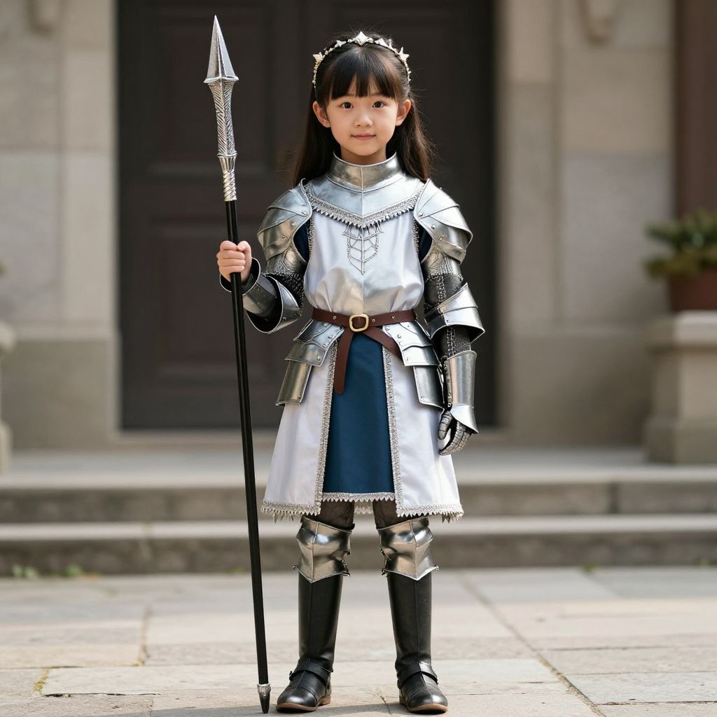 Photograph of a young Asian girl in medieval armor, holding a spear, standing in front of a stone building. Silver armor, blue dress, black
