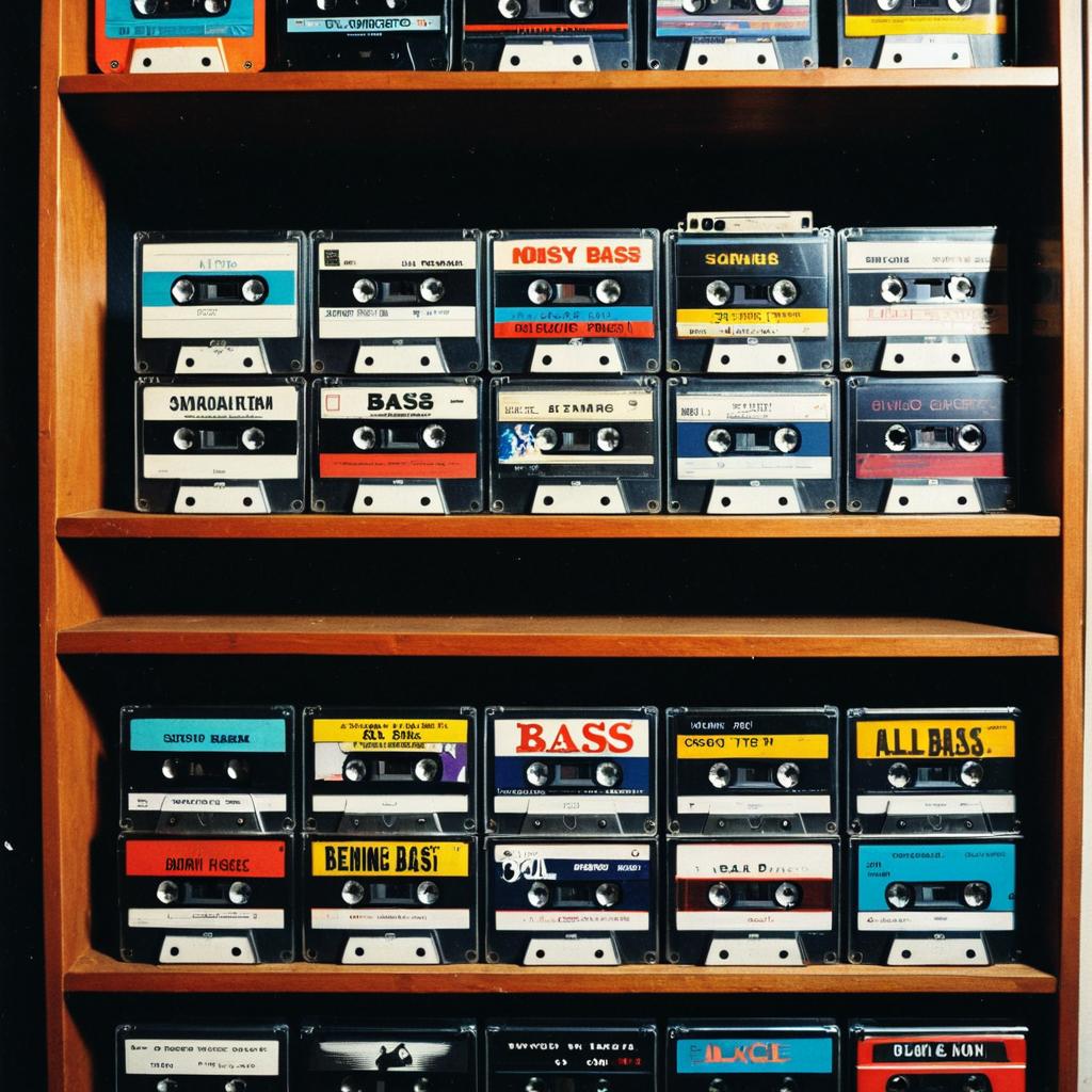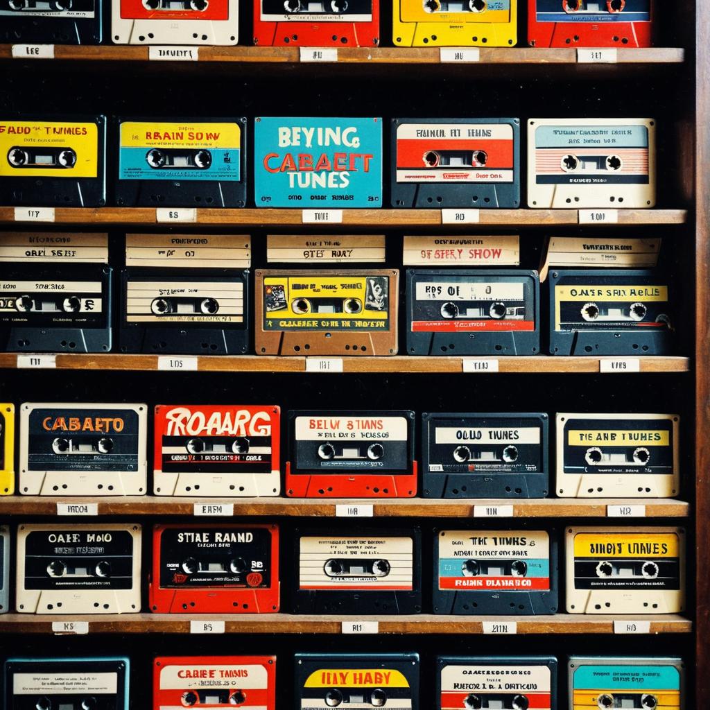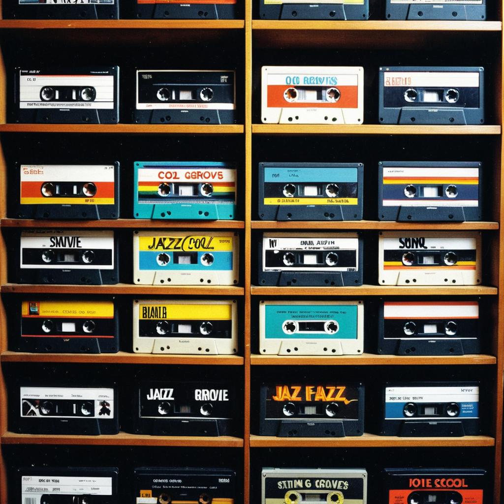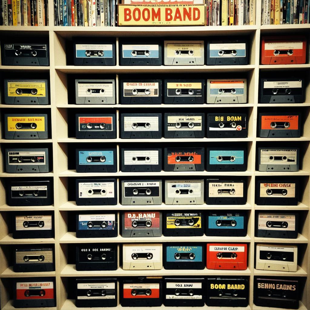 Close-up view of a shelf filled with vintage cassette tapes in their cases. Each tape is labeled with various 1970s band names, showcasing a mix of colorful and monochrome designs. The arrangement reflects a retro aesthetic reminiscent of the 1970s era music culture.
